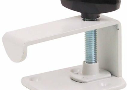Feststeller für Hubtischgestelle Zur stabilen Bodenverankerung. Das Unterteil wird am Boden festgeschraubt. Sorgt für eine sichere Arretierung des Tischgestells während der Fahrt. Farbe: lichtgrau (RAL 7035)