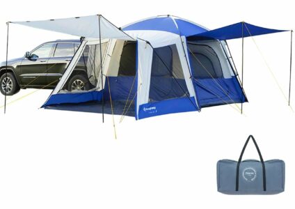 KingCamp präsentiert mit dem Modell Meilfi Plus ein modernes, freistehendes Familienzelt mit optimaler Raumnutzung und 220 cm Stehhöhe. Die Besonderheit des Meilfi Plus ist seine Funktion als Heckzelt für Busse oder SUV. Über eine Schleuse kann so jederzeit Zugriff auf den Kofferraum genommen werden. Das Zelt besitzt einen Vorraum mit Klarsicht-Fenstern (+ Gardinen) und 2 als Sonnensegel verwendbare Eingänge. Das Innenzelt ist mit einem fest eingenähten Boden ausgestattet und verfügt über eine…