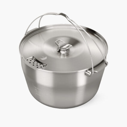 Aus 100 % robustem Edelstahl – ein praktischer, pflegeleichter Kochtopf. Er fühlt sich bei jeder Art von Feuer wohl, sogar über einem Lagerfeuer, für bleibende Eindrücke. Kapazität::5 Liter, für eine Mahlzeit mit 6 Personen | Leicht, 1.300 g | Ø 24 × 15 cm.|Wärmeleistung::Beim Erhitzen Handschuhe/Topflappen verwenden, um den Deckel/Topf zu heben. |Vielseitigkeit::Wird überall eingesetzt, auf allen Herdarten, außer in der Mikrowelle. |Widerstandsfähigkeit::Strapazierfähig, 100 % aus rostfreiem Stahl 18/8 (304) |Einfache Handhabung::Pflegeleicht ohne Antihaftbeschichtung und Material aus Edelstahl |Einfacher Transport::Für die Handhabung des Topfes: 2 seitliche Bügel und 2 Henkel an der Oberseite |Modularität::Deckel mit Löchern zum Schmoren und Abtropfen | 1 Haken zum Aufhängen|Einfache Instandhaltung::Mit warmem Seifenwasser waschen | Spülmaschinenfest | Trocknen lassen.