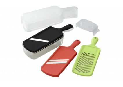 Möhren reiben, Kartoffeln schälen und Käse hobeln sind zwar nicht unbedingt die beliebtesten Tätigkeiten bei der Küchenarbeit, gehören aber einfach dazu. Kyocera bringt Küchenhelfern mit etwas Farbe und mehr Spaß ins Spiel. Das Hobelset sorgt für Abhilfe bei bekannten Küchenproblemen: ein Universalhobel, ein Julienne-Hobel und eine Reibe kommen hier im Set mit einer Aufbewahrungsbox, in die man direkt hineinhobeln kann. Diese verfügt über Silikonnoppen an der Unterseite, die das Verrutschen beim Reiben…