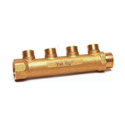 Zur zentralen Wasserverteilung (Kalt- und Warmwasser). Gut geeignet als Ersatz für bestehende Frischwasser-Verteiler aus Kunststoff, sehr stabil. Trinkwasserecht gemäß DIN Technische Daten: Material: Messing Maße: (H/B/T) 4,4 x 13 x 3,2 cm Temperatur: 200 °C max. Druck: 10 bar max. Gewicht: 0,251 kg Abgänge: 3 Abgänge oben: 1/2, Zugang Seite: 1/2, Abgang Seite: 3/4 Lieferumfang: 1 Frischwasserverteiler