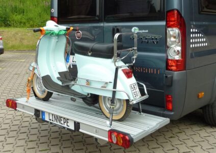 Lastenträger SLIDEPORT. Dieses formschöne, überwiegend aus Aluminium gefertigte Lastenträgersystem hat eine Nutzlast bis zu 170 kg. Es lässt sich dank eines rollengelagerten Schiebemechanismus auch im beladenen Zustand leicht nach links verschieben und gibt so den Zugang zu den Hecktüren frei. Durch die Befestigung mit Lenkerspanngurt und Zusatzgurten steht das Zweirad sicher auf der Plattform. Diese ist mit dem bewährten Linnepe-Nutensystem ausgestattet, das ein problemloses Befestigen ermöglicht. Die…