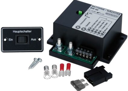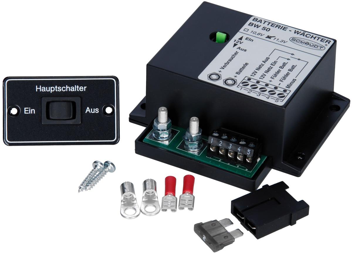 Batteriewächter BW 50 Batteriewächter speziell für die Verbraucher, die permanent Strom benötigen wie z.B. Schaltuhr der Heizung oder Frostschutzablassventil des Truma-Boilers. Schaltet, je nach Stellung des Hauptschalters, die Verbraucher früher oder später ab. Einschaltspannung 11,9 V: Abschaltspannung 11,3 V. Schaltleistung 50 A.