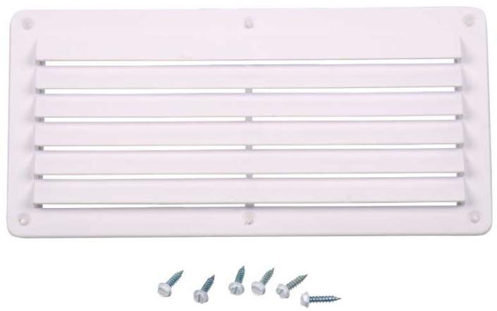 Weiße, aufschraubbare Gitter mit Lamellen. UV-beständiges ABS. Dichtmasse ist bereits aufgetragen. Aufbauhöhe ca.14mm. inkl. Schrauben. Produktmaß: 264 x 127mm
