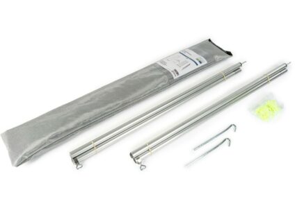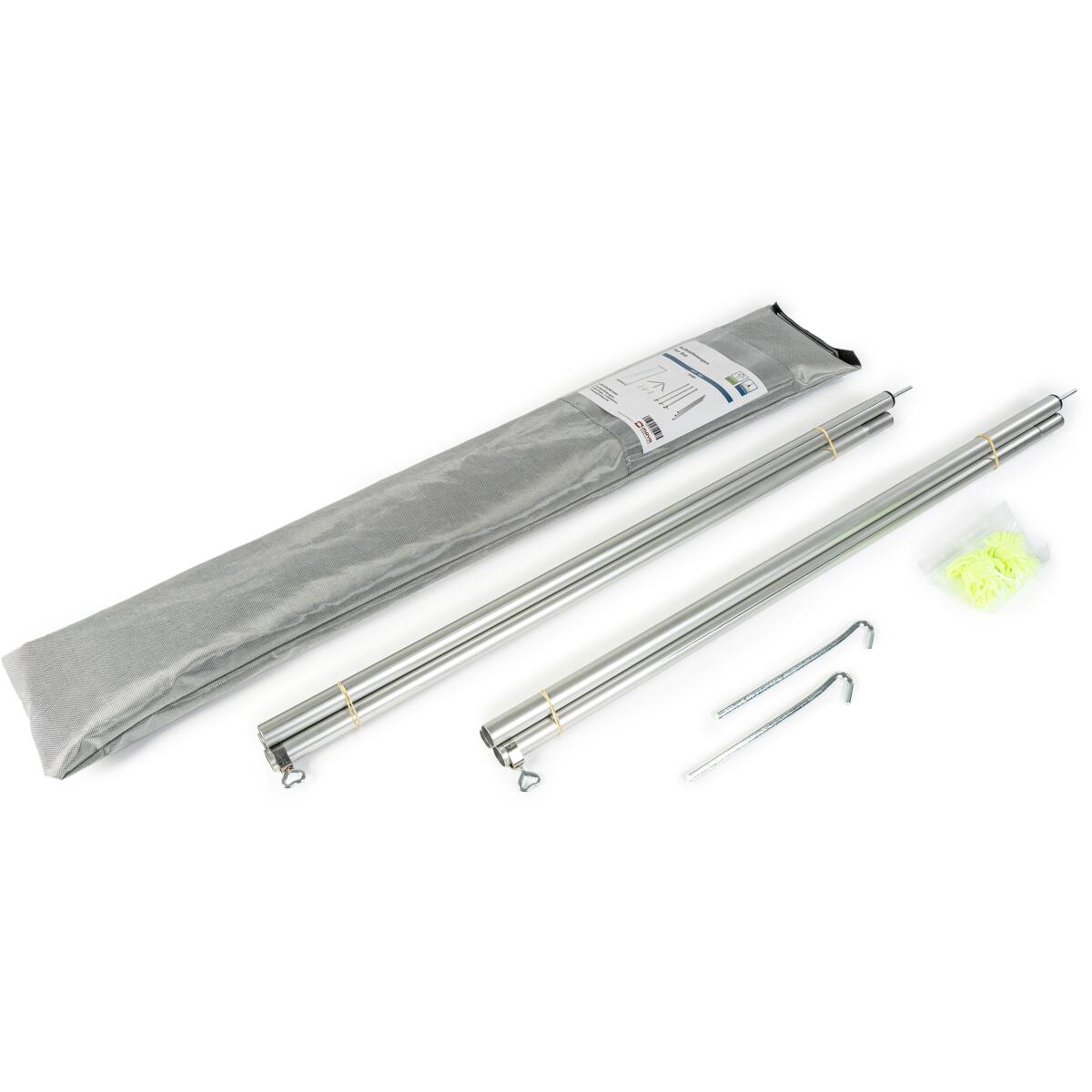 Aluminium Aufstellstangen-Set in praktischer Aufbewahrungstasche. Technische Daten: Packmaß: 91 x 17 x 4 cm Gewicht: 1,5 kg Material: Aluminium Lieferumfang: 2 Stangen (Ø 22mm) 2 Zeltleine 2 Heringe Aufbewahrungstasche