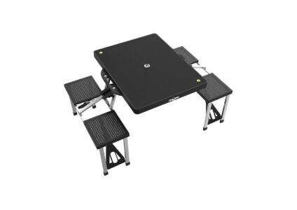 Der Picknickttisch ist blitzschnell aufgebaut und verfügt über 4 fest installierte Sitze, die je bis max. 60 kg belastbar sind. Der Tisch wird in der Mitte zu einem Koffer mit praktischem Tragegriff gefaltet und ist somit einfach zu transportieren. Der Tisch besitzt in der Mitte ein Schirmloch – für Regen oder Sonnenschirm. schneller Auf- und Abbau als Kindertisch geeignet Tisch mit Aussparung für Sonnenschirm Technische Daten: Gewicht: 6,5 kg Maße: B65 x L85 x H67 cm Packmaß: 65 x 85 x 11 cm Material…
