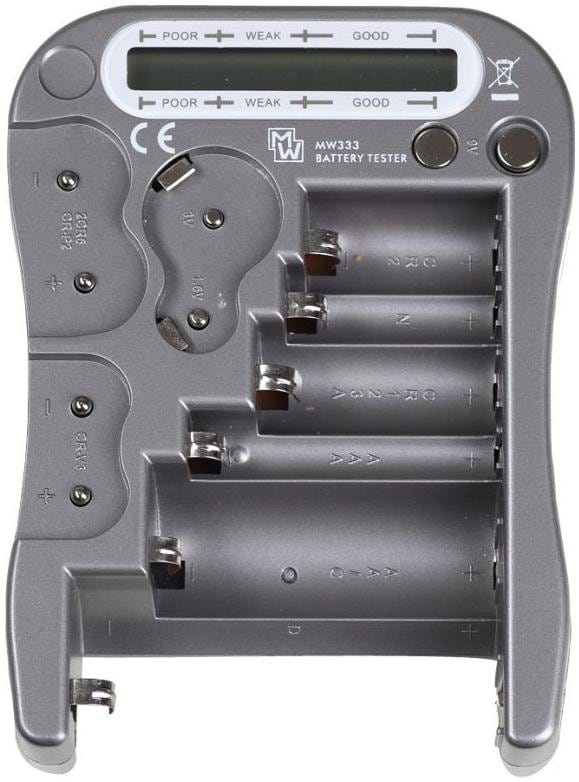 Kapazitäts-Testgerät für mehr als 12 Batterietypen. Anhand eines LCD-Balkens ist die genaue Restkapazität von Batterien und Akkus ersichtlich, für Batterien und Akkus der Größen Micro (AAA), Mignon (AA), Baby (C), Mono (D), 9V-Block (6LR61) CR-123, CR-2, 2CR5, CR-P2, CR-V3, 1,5V und 3V Knopfzellen, Spannungsversorgung 1 Micro. Technische Daten: Typ: MW 333/LX5900/Digi-Tester Maße (B x T x H): 118 × 23 × 84 mm Gewicht: 133 g