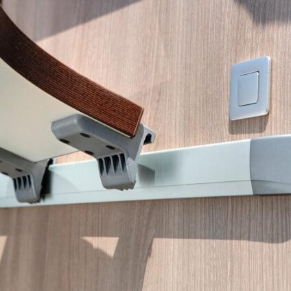 Verstellbares Halterungssystem zur Befestigung eines Tisches. Die verschiebbaren Halterungen lassen sich leicht an unterschiedliche Tischabmessungen anpassen. Aus Kunststoff und eloxiertem Aluminium. Länge 950 mm, Höhe 35 mm.Verstellbares HalterungssystemLeicht anpassbar an unterschiedliche TischabmessungenMaterial: Kunststoff und eloxiertes AluminiumTechnische Daten:Länge: 950 mmHöhe: 35 mm