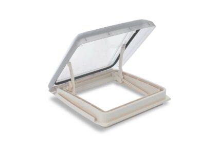 Ansprechende Rauchglas-Dachhaube mit Doppelverglasung und ansprechendem Innenrahmen. sehr einfache Einhandbedienung durch Bügelgriff stufenlos aufstellbar bis 50° automatische Ver-/Entriegelung aerodynamische Haube geringe Fahrgeräusche Rauchglashaube für besseren UV-Schutz Dauerbelüftung bis zu 150 cm2 Technische Daten: Dachstärke bis: 60 mm Dachstärke von: 25 mm Ausschnitt Nennmaß: 400 × 400 mm Höhe über Dach: 80 mm Haubengröße: 490 x 470 mm Farbe: weiß Lieferumfang: 1 x Dachhaube VisionStar M pro 2…