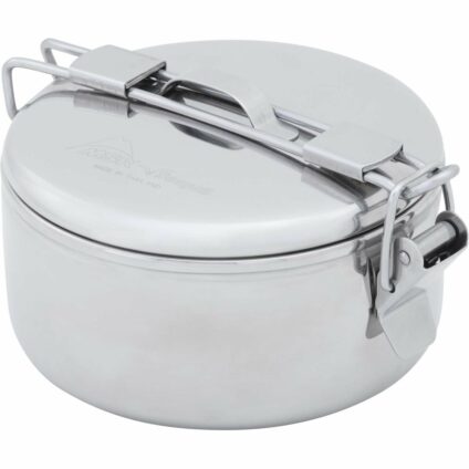 Diese Edelstahltöpfe halten häufige Nutzung aus und stellen eine hochwertige, strapazierfähige Kochgeschirroption dar. Sie sind ideal für Pfadfinder und Campinganfänger geeignet. Der leicht zu hebender Scharniergriff lässt sich über den passgenauen Deckel klappen, um diesen zu befestigen. leicht und platzsparend mit Scharniergriffen Technische Daten: Farbe: silber Material: Edelstahl Volumen: 475 ml Gewicht: 270 g Maße: 11,7 x 7,6 cm Lieferumfang: 1 Edelstahltopf (475ml)