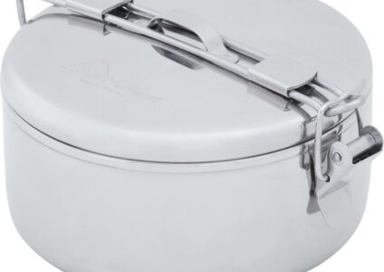 Diese Edelstahltöpfe halten häufige Nutzung aus und stellen eine hochwertige, strapazierfähige Kochgeschirroption dar. Sie sind ideal für Pfadfinder und Campinganfänger geeignet. Der leicht zu hebender Scharniergriff lässt sich über den passgenauen Deckel klappen, um diesen zu befestigen. leicht und platzsparend mit Scharniergriffen Technische Daten: Farbe: silber Material: Edelstahl Volumen: 775 ml Gewicht: 370 g Maße: 14,2 x 8,6 cm Lieferumfang: 1 Edelstahltopf (775ml)