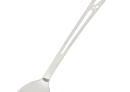 Edelstahllöffel mit Düsen- und Kabelwerkzeug für Flüssigbrennstoffkocher von MSR mit besonders langem Griff für hohe Töpfe und aufstellbare Beutel mit Mahlzeiten.