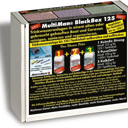 MultiMan® BlackBox zur Sanierung und Regeneration stark verunreinigter oder alter Trinkwasseranlagen. MultiMan® BlackBox sicher verwenden. Vor Gebrauch stets Etikett und Produktinformation lesen. Gebrauchsanweisung: 1. Reinigen von Tank und Leitungen: MultiNox® KeimEx Strong entfernt alte Biofilme mit konzentriertem Aktivsauerstoff. Schalten Sie bei den folgenden 3 Schritten den Boiler aus, damit er nicht heizt. Lösen Sie KeimEx Strong (Dosierung:100 g/100 l Tankinhalt) komplett in Trinkwasser von ¼ des…
