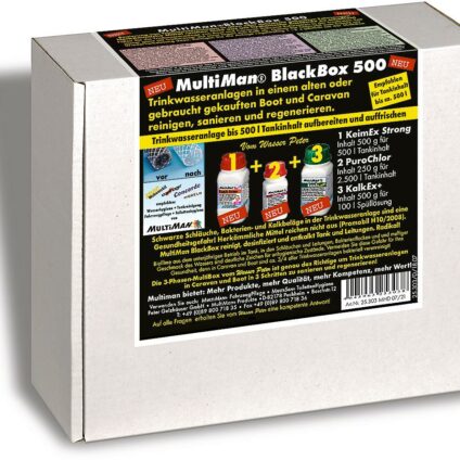 MultiMan® BlackBox zur Sanierung und Regeneration stark verunreinigter oder alter Trinkwasseranlagen. MultiMan® BlackBox sicher verwenden. Vor Gebrauch stets Etikett und Produktinformation lesen. Gebrauchsanweisung: 1. Reinigen von Tank und Leitungen: MultiNox® KeimEx Strong entfernt alte Biofilme mit konzentriertem Aktivsauerstoff. Schalten Sie bei den folgenden 3 Schritten den Boiler aus, damit er nicht heizt. Lösen Sie KeimEx Strong (Dosierung:100 g/100 l Tankinhalt) komplett in Trinkwasser von ¼ des…