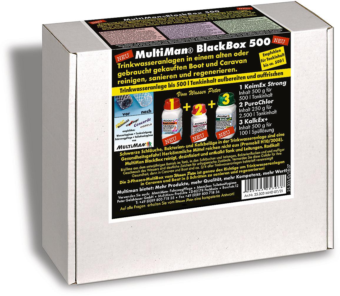 MultiMan® BlackBox zur Sanierung und Regeneration stark verunreinigter oder alter Trinkwasseranlagen. MultiMan® BlackBox sicher verwenden. Vor Gebrauch stets Etikett und Produktinformation lesen. Gebrauchsanweisung: 1. Reinigen von Tank und Leitungen: MultiNox® KeimEx Strong entfernt alte Biofilme mit konzentriertem Aktivsauerstoff. Schalten Sie bei den folgenden 3 Schritten den Boiler aus, damit er nicht heizt. Lösen Sie KeimEx Strong (Dosierung:100 g/100 l Tankinhalt) komplett in Trinkwasser von ¼ des…