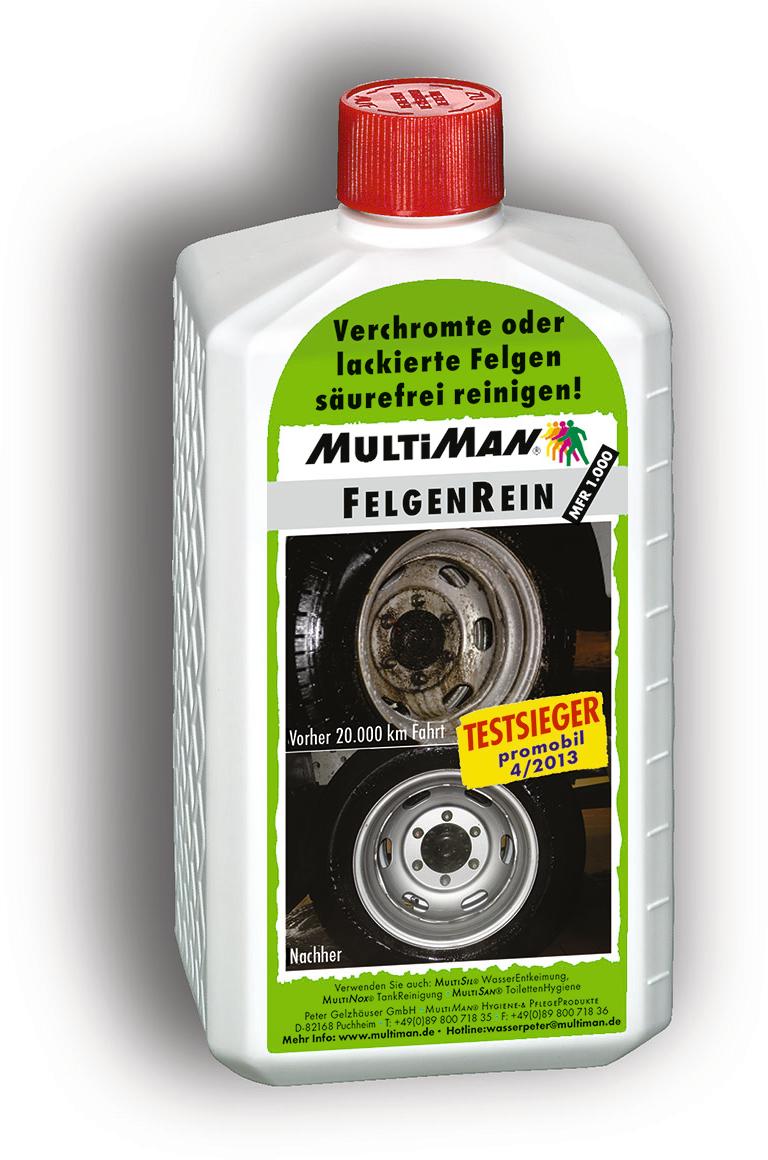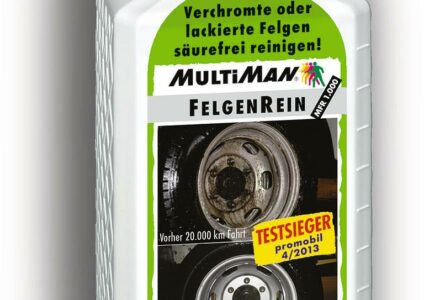 MultiMan® FelgenReiniger entfernt extreme Verschmutzungen an verchromten oder lackierten Felgen aus Leichtmetall und Stahl. Eingebrannter Bremsstaub, Fett, Teer und Straßenschmutz werden säurefrei, schonend und wirksam entfernt. Stahlfelgen werden duch Rostinhibitor gleichzeitig vor Korrosion geschützt. MultiMan® FelgenReiniger sicher verwenden. Vor Gebrauch stets Etikett und Produktinformation lesen. Gebrauchsanweisung: MultiMan® FelgenRein vor Einfahrt in die Waschanlage oder manueller Reinigung auf…
