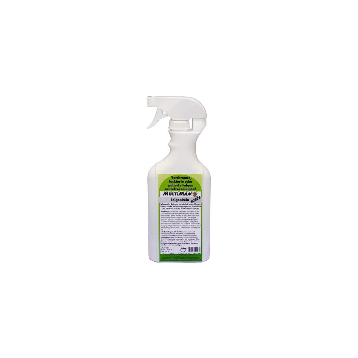 MultiMan® FelgenReiniger entfernt extreme Verschmutzungen an verchromten oder lackierten Felgen aus Leichtmetall und Stahl. Eingebrannter Bremsstaub, Fett, Teer und Straßenschmutz werden säurefrei, schonend und wirksam entfernt. Stahlfelgen werden duch Rostinhibitor gleichzeitig vor Korrosion geschützt. MultiMan® FelgenReiniger sicher verwenden. Vor Gebrauch stets Etikett und Produktinformation lesen. Gebrauchsanweisung: MultiMan® FelgenRein vor Einfahrt in die Waschanlage oder manueller Reinigung auf…