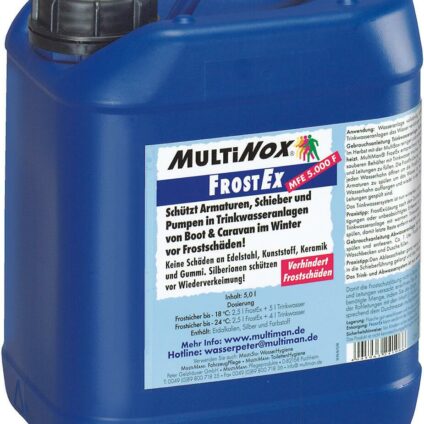 Gebrauchsanleitung Trinkwasseranlage: Boiler ausschalten, dass er nicht heizt. Im Herbst mit der MultiBox reinigen und entleeren. MultiMan® FrostEx entsprechend der gewünschten Frostsicherheit in einem sauberen Behälter mit Trinkwasser mischen. Die Menge muss ausreichen, um Boiler und Leitungen zu füllen. Die FrostEx-Lösung in den leeren Tank füllen. Nacheinander jeden Wasserhahn öffnen um die FrostEx-Lösung in Leitungen, Pumpe, Boiler und Armaturen zu spülen um das Wasser zu verdrängen. Dabei…