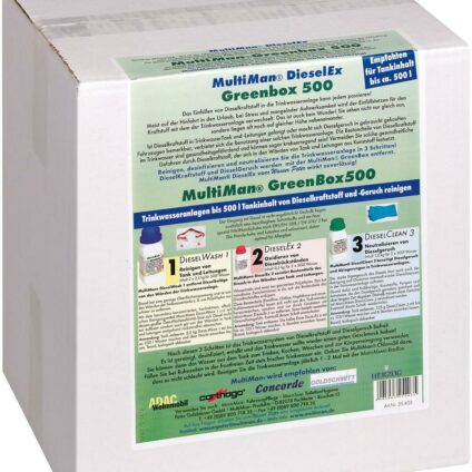 MultiMan® GreenBox um Dieselverunreinigungen aus Trinkwasseranlagen in 3 Stufen nachhaltig zu entfernen. MultiMan® GreenBox sicher verwenden. Vor Gebrauch stets Etikett und Produktinformation lesen. Gebrauchsanweisung: MultiMan® DieselWash 1 entfernt Dieselbeläge von den Wänden der Trinkwasseranlage. Diesel hat eine geringe Oberflächenspannung und ist von den Wänden der Trinkwassertanks z. B. aus Polyäthylen nur schwer zu entfernen. Mit dem besonders konzentrierten, hochaktiven, alkalischen…