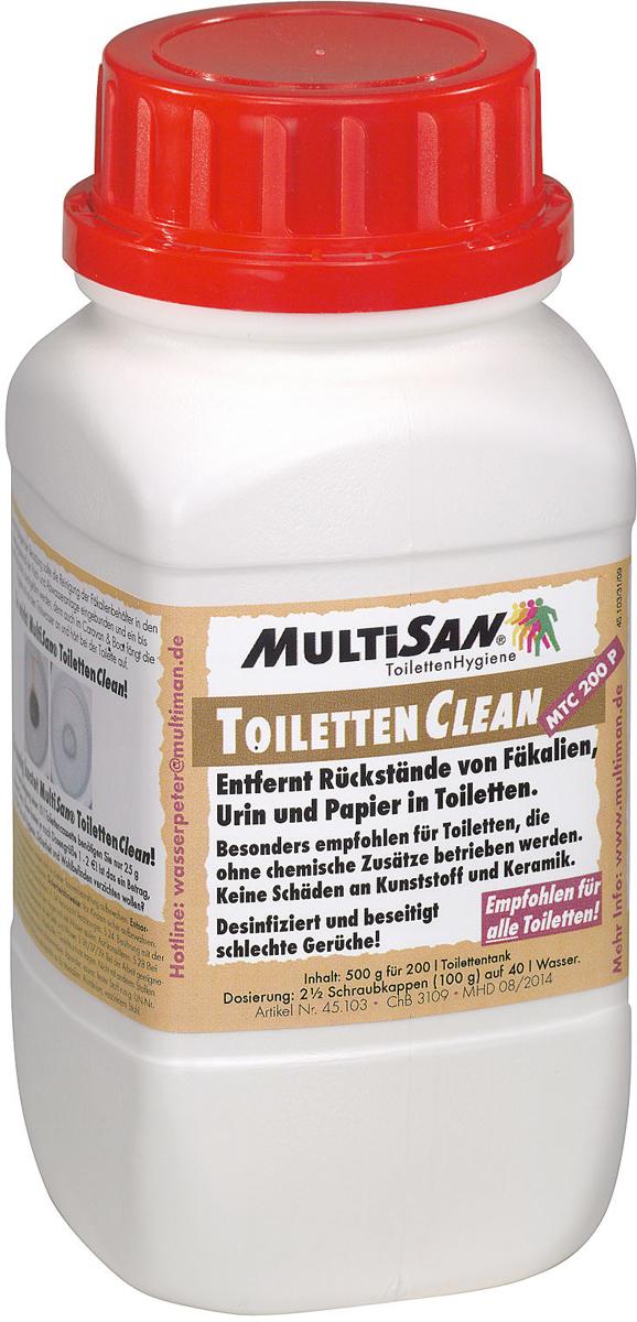 MultiSan® ToilettenClean+ sicher verwenden. Vor Gebrauch stets Etikett und Produktinformation lesen. Gebrauchsanleitung: Cassette oder Festtank entleeren. 50 g ToilettenClean+ pro 20 l Inhalt unter rühren in warmes Wasser einfüllen. Über Nacht einwirken lassen. Cassette an Entsorgungsstation oder in der häuslichen Toilette zur Hälfte entleeren und dann gut schütteln, damit sich die Beläge lösen. Festtank an der Entsorgungsstation zur Hälfte entleeren und dann mehrere Fahrbewegungen machen, damit sich…