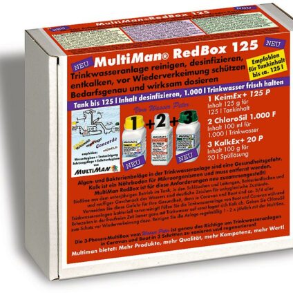 MultiMan® RedBox für die jährliche Unterhaltsreinigung der Trinkwasseranlage in Gebrauch befindlicher Fahrzeuge mit mäßig verunreinigten Trinkwasseranlagen mit frischen Biofilmen! MultiMan® MultiBox sicher verwenden. Vor Gebrauch stets Etikett und Produktinformation lesen. Gebrauchsanweisung: 1. Reinigen von Tank und Leitungen: MultiMan® KeimEx+ entfernt alte Algen- und Bakterienbeläge mit starkem Aktivsauerstoff. Schalten Sie den Boiler aus, damit er nicht heizt. Lösen Sie KeimEx (Dosierung:100 g/100 l…