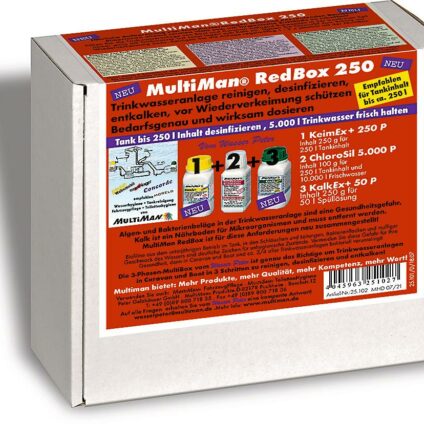 MultiMan® RedBox für die jährliche Unterhaltsreinigung der Trinkwasseranlage in Gebrauch befindlicher Fahrzeuge mit mäßig verunreinigten Trinkwasseranlagen mit frischen Biofilmen! MultiMan® MultiBox sicher verwenden. Vor Gebrauch stets Etikett und Produktinformation lesen. Gebrauchsanweisung: 1 Reinigen von Tank und Leitungen: MultiMan® KeimEx+ entfernt alte Algen- und Bakterienbeläge mit starkem Aktivsauerstoff. Schalten Sie den Boiler aus, damit er nicht heizt. Lösen Sie KeimEx (Dosierung:100 g/100 l…