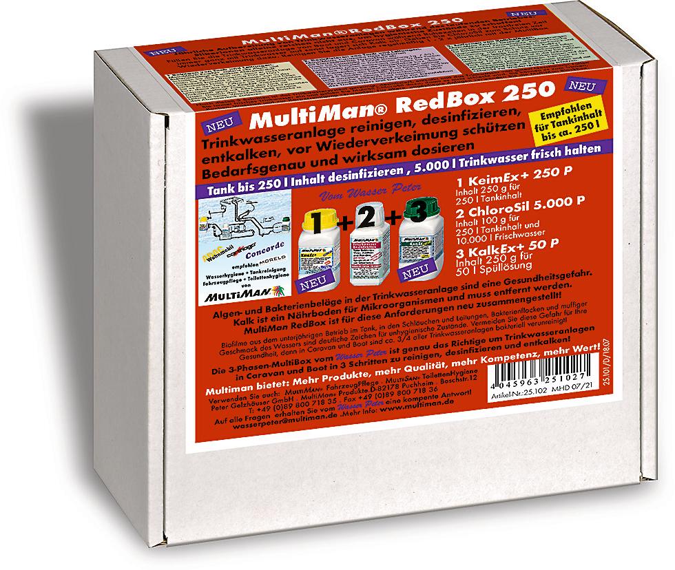 MultiMan® RedBox für die jährliche Unterhaltsreinigung der Trinkwasseranlage in Gebrauch befindlicher Fahrzeuge mit mäßig verunreinigten Trinkwasseranlagen mit frischen Biofilmen! MultiMan® MultiBox sicher verwenden. Vor Gebrauch stets Etikett und Produktinformation lesen. Gebrauchsanweisung: 1 Reinigen von Tank und Leitungen: MultiMan® KeimEx+ entfernt alte Algen- und Bakterienbeläge mit starkem Aktivsauerstoff. Schalten Sie den Boiler aus, damit er nicht heizt. Lösen Sie KeimEx (Dosierung:100 g/100 l…