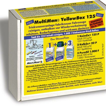 MultiMan® YellowBox für die Erstreinigung der Trinkwasseranlage bei Inbetriebnahme von neuen Fahrzeugen! MultiMan® MultiBox sicher verwenden. Vor Gebrauch stets Etikett und Produktinformation lesen. Gebrauchsanleitung: 1. Reinigen von Tank und Leitungen: MultiNox® KeimEx entfernt alte Algen- und Bakterienbeläge mit starkem Aktivsauerstoff. Schalten Sie den Boiler aus, damit er nicht heizt. Lösen Sie KeimEx (Dosierung:100 g/100 l Tankinhalt) komplett in Trinkwasser von ¼ des Tankinhaltes (unter rühren…
