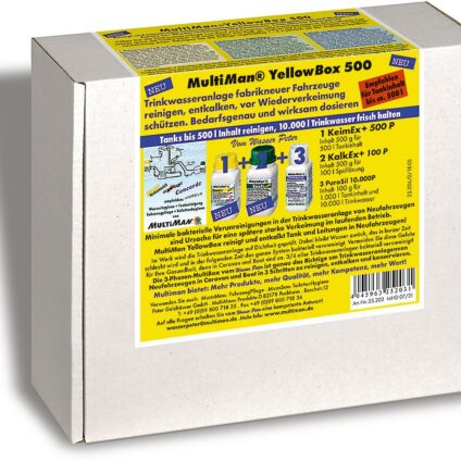 MultiMan® YellowBox für die Erstreinigung der Trinkwasseranlage bei Inbetriebnahme von neuen Fahrzeugen! MultiMan® MultiBox sicher verwenden. Vor Gebrauch stets Etikett und Produktinformation lesen. Gebrauchsanleitung: 1. Reinigen von Tank und Leitungen: MultiNox® KeimEx entfernt alte Algen- und Bakterienbeläge mit starkem Aktivsauerstoff. Schalten Sie den Boiler aus, damit er nicht heizt. Lösen Sie KeimEx (Dosierung:100 g/100 l Tankinhalt) komplett in Trinkwasser von ¼ des Tankinhaltes (unter rühren…