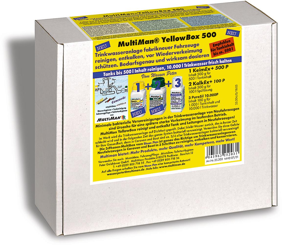 MultiMan® YellowBox für die Erstreinigung der Trinkwasseranlage bei Inbetriebnahme von neuen Fahrzeugen! MultiMan® MultiBox sicher verwenden. Vor Gebrauch stets Etikett und Produktinformation lesen. Gebrauchsanleitung: 1. Reinigen von Tank und Leitungen: MultiNox® KeimEx entfernt alte Algen- und Bakterienbeläge mit starkem Aktivsauerstoff. Schalten Sie den Boiler aus, damit er nicht heizt. Lösen Sie KeimEx (Dosierung:100 g/100 l Tankinhalt) komplett in Trinkwasser von ¼ des Tankinhaltes (unter rühren…