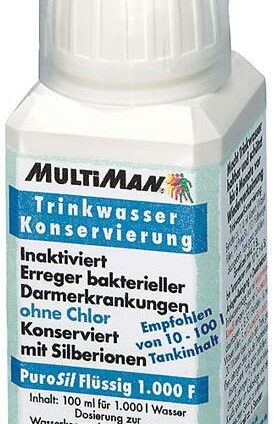 MultiMan® PuroSil konserviert klares Trinkwasser mit Silberionen und macht es in einem gereinigten Trinkwassersystem haltbar. Trinkwasser-Konservierung: Behälter zu 1/4 mit klarem Wasser füllen, 1g PuroSil /50 l Füllmenge dazugeben, Tank ganz auffüllen. Einwirkzeit mind. 2 St., bei Tempraturen unter 10 oC > 4 St. Anlagen-Reinigung + Desinfektion: Anlage zuerst mit MultiMan KeimEx reinigen, entleeren. Zur Desinfektion Behälter zu ca. ¼ mit Trinkwasser füllen, 5 g ChloroSil / 50 l Tankinhalt dazugeben….