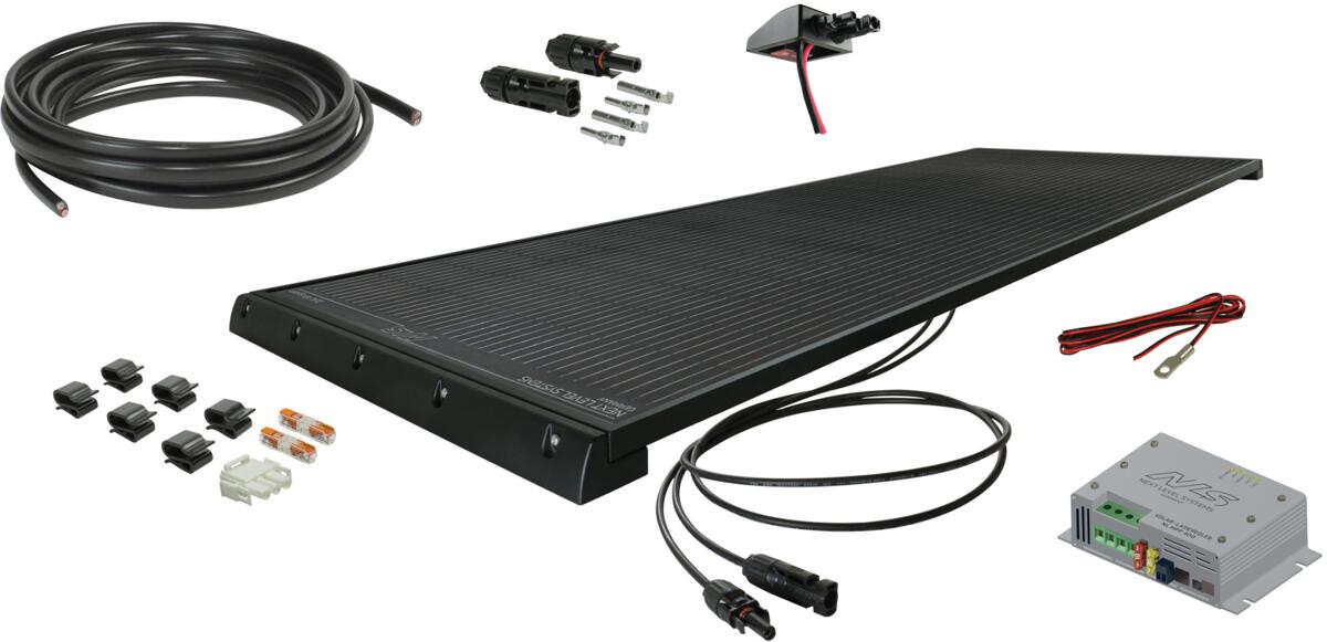 Komplettset ausgestattet mit allen erforderlichen Bauteilen, die benötigt werden, um eine NL DUAL AIR Solaranlage in ein Reisefahrzeug einzubauen.Um den Einbau schnell und einfach durchzuführen, sind an den DUAL AIR Solarmodulen die Spoilerprofile und die steckbaren Anschlusskabel bereits vormontiert.Innenraumkabel (6 m) liegen ebenso bei, wie das aufklebbare MC4 Dachdurchführung-Set. Aufsteckbare Halteclips sowie Wago-Klemmen und ein EBL-Steckverbinder werden mitgeliefert, um den Solarstrom in…