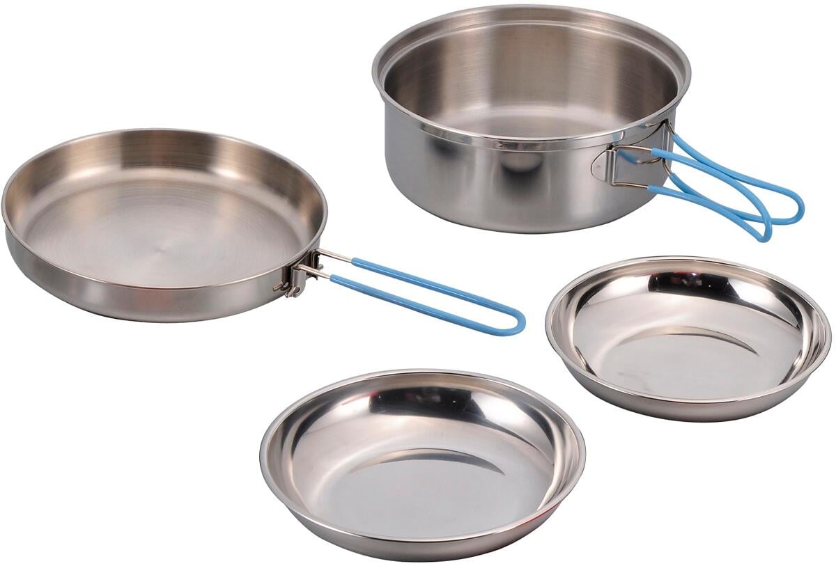 Klassisches Kochset aus hochwertigem Edelstahl für 2 Personen. Das Set umfasst einen Kochtopf, eine Pfanne und zwei tiefe Teller. Sollte die Pfanne nicht gebraucht werden, kann sie auch als Deckel für den Topf verwendet werden, um das Kochen zu beschleunigen. Die Teller kann man bequem ineinander stapeln und für den Transport im Topf verstauen. Des Weiteren verfügen der Topf und die Pfanne über gummierte Klappgriffe für ein kompaktes und platzsparendes verstauen im Gepäck. Ideales Set für 2 Personen…