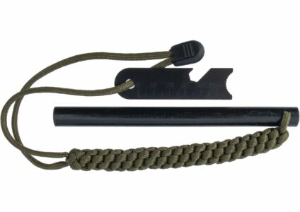 Mit bis zu 22.000 Zündungen gehört der Zündstahl ',Goliath', zu den langlebigsten seiner Art. Die Größe macht die Handhabung vor allem mit dem Messerrücken sehr einfach und effektiv. Ausgestattet mit ca. 3 m Paracord ist der Zündstahl unerlässlich für jede professionelle Survivalausrüstung. ca. 22.000 Zündungen gänzlich unempfindlich gegen Feuchtigkeit mit ca. 3 m Paracord Technische Daten: Gewicht: 149 g Maße Zündstahl: 15 cm x Ø 1,2 cm Material Feuerstahl: Magnesiumlegierung Farbe: schwarz…