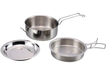 Praktisches, robustes Kochset aus hochwertigem Edelstahl, bestehend aus einem Topf, einer Pfanne und einem tiefen Teller. Der Topf und die Pfanne verfügen über Klappgriffe. Darüber hinaus lassen sich Pfanne und Teller bequem in den Topf stapeln. Für einen sicheren Transport des Sets sorgt der am Topf angebrachte Schnappverschluss. Hiermit lassen sich der in den Topf gestapelte Teller und die Pfanne durch den Griff des Topfes fixieren. Das Set kann somit platzsparend im Gepäck verstaut werden. Praktisch…
