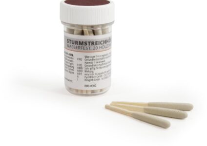 In dieser kleinen Plastikdose mit Schraubverschluss und Reibfläche (auf dem Deckel), sind die Hölzer spritzwassergeschützt und sicher untergebracht. Die Sturmstreichhölzer haben einen langen Schwefelkopf und brennen deshalb auch bei stärkerem Wind. Die Schutzschicht über dem Hölzchen macht diese wasserfest. 20 Hölzchen. Spritzwassergeschützt längerer Schwefelkopf wasserabweisende Schutzschicht Technische Daten: Maße: 32 x 53 mm Gewicht: 15 g Achtung! Nur über feuerfester Unterlage abbrennen! Nur im…