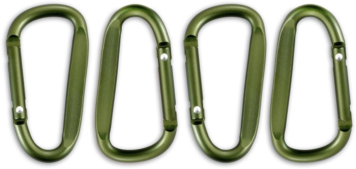 Praktische Zubehörkarabiner im 4er Pack. Ob zur Befestigung von Zubehör und Equipment, als Schlüsselbund oder zum Organisieren Ihres Camps, der Werkstatt oder der Garage. Praktisch, stabil, leicht und einfach universell einsetzbar Nicht zur Personensicherung geeignet! Technische Daten: Material: Aluminium Maße: 76 x 7 mm Farbe: oliv Lieferumfang: 4 Karabinerhaken