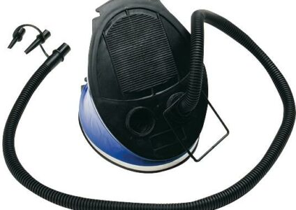 Klassische Fußpumpe für Luftmatratzen, kleine bis mittlere Luftspielzeuge und Schlauchboote. sowohl zum Aufpumpen als auch zum Abblasen verwendbar Technische Daten Größe: 19 x 7.5 x 27 cm (BxTxH) Volumen: 3 L Farbe: blau Gewicht: 0.5 kg Lieferumfang: Blasebalg, drei verschiedene Düsen