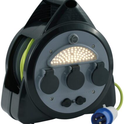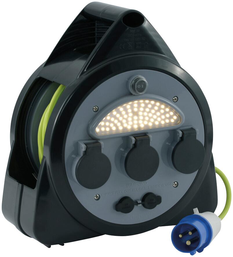 n dieser Kabeltrommel sind neben den drei Schukosteckdosen auch noch zwei USB-Ports eingebaut sowie eine LED-Leuchte mit 74 LEDS (schaltbar) und einem Nachtlicht. Mit CEE-Stecker für den Schaltkasten auf europäischen Campingplätzen und 15 Meter Kabel (gut sichtbar dank leuchtgrüner Farbe). Mit Sicherung und FU-Schalter. CEE 3 x Schukodose – 2 x USB LED-Leuchte Mit Polaritätswarnung Gschützt gemäß IP44 Technische Daten Kabellänge: 15 m Gewicht: 4 kg CEE-Stecker, 3 Schukosteckdosen, 2 USB-Ports 74…