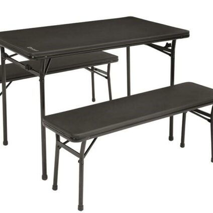 Das Outwell Picknick Set Pemberton besteht aus einem Tisch sowie zwei Sitzbänken und eignet sich bestens für den Urlaub, zum Campen oder fürs Festival. Es kommt bereits fertig montiert und lässt sich in Sekunden auf- und zuklappen. Für den Transport werden die Bänke am Tisch befestigt und durch das kleine Packmaß sowie das geringe Gewicht ist das Set einfach zu transportieren. Der stabile Stahl und der langlebige, wassserbeständige Kunststoff sorgen für eine lange Haltbarkeit. Wasserdichte Tischplatte…