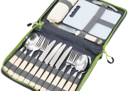 Praktische Besteckset mit Netztasche. Eignet sich speziell zum Grillen und zum Picknicken. Im Set enthalten sind 4 Gabeln, 4 Messer, 4 Servietten, 1 Brettchen, 1 Flaschenöffner und 1 Buttermesser. Inkl. Tasche. Das Besteck ist spülmaschinengeeignet. Netztasche außen Technische Daten: Material: 600D 100% Polyester, Innenfutter mit Silber-Alu-Folie Größe: 28 x 5 x 23 cm (BxTxH) Farbe: weiß Gewicht: 900 g Lieferumfang: 4 Messer, 4 Gabeln, 4 Löffel, 4 Servietten, 1 Käsemesser, 1 Flaschenöffner, 1…