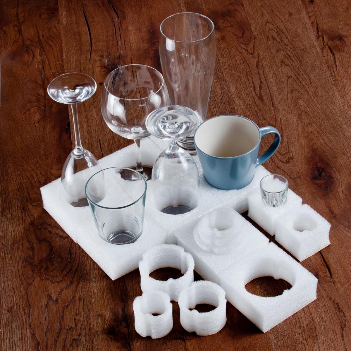 Das Tray ist in seiner Art nach innen für unterschiedliche Glasgrößen, als auch nach außen für unterschiedliche Schrankmaße flexibel und individuell einsetzbar. Selbstklebende Einzelkomponenten Durch die vorperforierten Ausgleichstücke ist eine optimale Schrankanpassung möglich Material: unvernetzter Polyethylenschaum Gewicht: ca. 400 g Das Gläserhalterset besteht aus: 1 Basisplatte 400 x 500 mm 2 Ausgleichsprofile 500 x 40 mm 12 Glashalter groß – 100 x 100 mm mit je 3 Innenringen 5 Glashalter klein –…