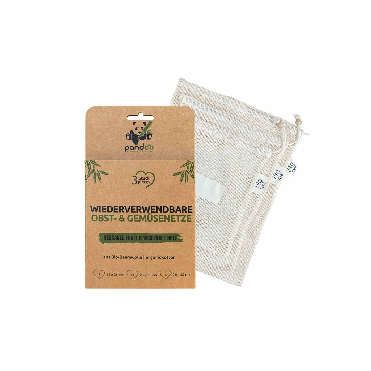 Obst und Gemüse gehen hier gerne ins Netz Die Obst- und Gemüsenetze von pandoo helfen beim Verzicht auf Einwegplastik im Supermarkt, auf dem Wochenmarkt oder im Unverpackt-Laden. Die hochwertig verarbeiteten Netze kommen in drei verschiedenen Größen und sind stabil vernäht. Die leichten Gemüsenetze sind aus Bio-Baumwolle. Mithilfe einer aufgezogenen Bambusperle und des Kordelzugs kann der Einkauf sicher transportiert werden. Jedes Netz ist mit Gewichtsangabe auf einem Etikett versehen und hat eine…