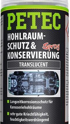 Der Petec Hohlraumschutz & Konservierung ist ein effizienter Schutz für Bereiche, die einem erhöhten Risiko von Korrosion ausgesetzt sind. Die hochwirksame Zusammensetzung ermöglicht die Erreichung auch schwer zugänglicher Karosseriehohlräume. Das Produkt trocknet schnell und bildet einen dauerhaften, plastischen Schutzfilm, der optimalen Langzeitschutz bietet. Eine beigelegte 60 cm lange Sprühsonde ermöglicht leichtes und gezieltes Auftragen.Optimaler Schutz in verschiedenen korrosionsgefährdeten…