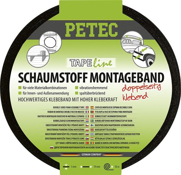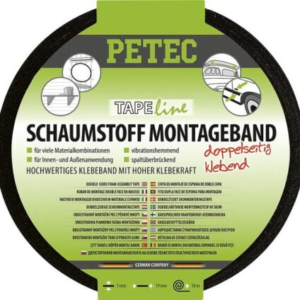 Petec Schaumstoff-Montageband, 2 m, schwarzDoppelseitiges Schaumstoff-Klebeband mit guter Klebekraft. Für viele Materialkombinationen, hohe Klebekraft, ausgezeichnete Scherfestigkeit und vibrationshemmend.Gute Klebekraft für verschiedene MaterialienHohe KlebekraftAusgezeichnete ScherfestigkeitVibrationshemmendTechnische Daten:Länge: 2 mBreite: 12 mmDicke: 1 mmFarbe: schwarz