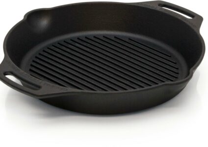 Die gusseiserne Petromax Grill-Feuerpfanne gibt es in zwei Ausführungen: Mit klassischem Pfannenstiel oder mit zwei Henkeln. Das Anbraten mit Grillmuster ist mit den Grill-Feuerpfannen ganz einfach. Dank Grill-Rillen am Boden der Gusspfannen können Fleisch, Gemüse und Co. über dem offenen Feuer oder in der heimischen Küche zubereitet werden. Die PetromaxFeuerpfanne funktioniert auf allen Herdarten (Induktion, Gas und Glaskeramik). Technische Daten: Ø 30 x H 5 cm 3,6 kg Inhalt 2,5 L