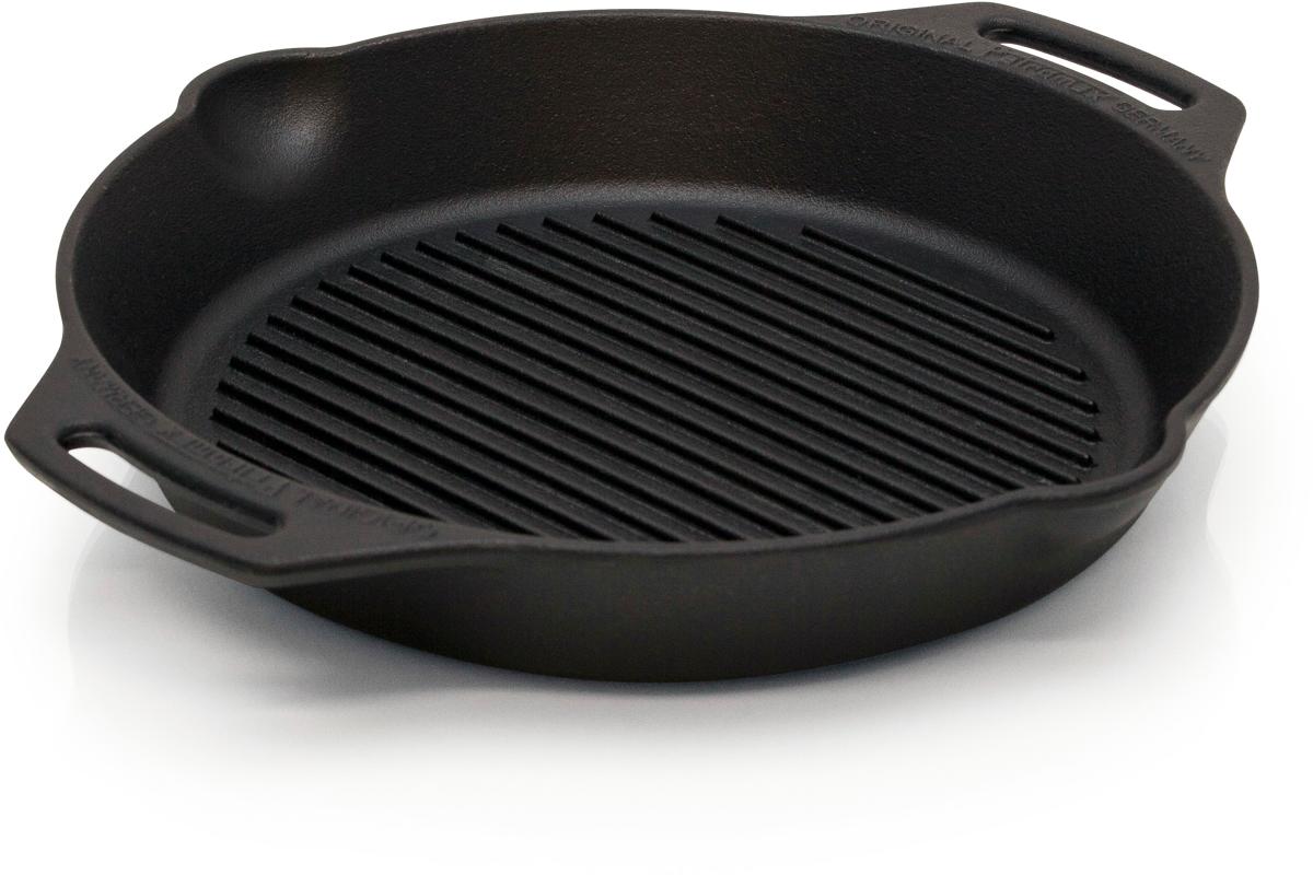 Die gusseiserne Petromax Grill-Feuerpfanne gibt es in zwei Ausführungen: Mit klassischem Pfannenstiel oder mit zwei Henkeln. Das Anbraten mit Grillmuster ist mit den Grill-Feuerpfannen ganz einfach. Dank Grill-Rillen am Boden der Gusspfannen können Fleisch, Gemüse und Co. über dem offenen Feuer oder in der heimischen Küche zubereitet werden. Die PetromaxFeuerpfanne funktioniert auf allen Herdarten (Induktion, Gas und Glaskeramik). Technische Daten: Ø 30 x H 5 cm 3,6 kg Inhalt 2,5 L