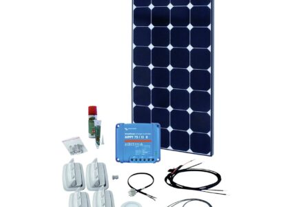Regler mit Bluetoothfunktion Technische Daten: Leistung: 120 W Spannung: 12 VDC Maße 53,7 x 3,5 x 103,1 cm (B x H x T) Gewicht: 10,3 kg Lieferumfang: 1 Solarmodul, 120 W, 12 VDC 1 Regler Victron Smart Solar 75/15 1 Modulbefestigung Kit Easy Mount One 1 Dachdurchführung Water Tight One 1 Klebeset Easy Bond One 5 m Modulkabel QuickCab4 1,5 m Batteriekabel mit Sicherung (20 A) 1 Adapterkabel für EBL