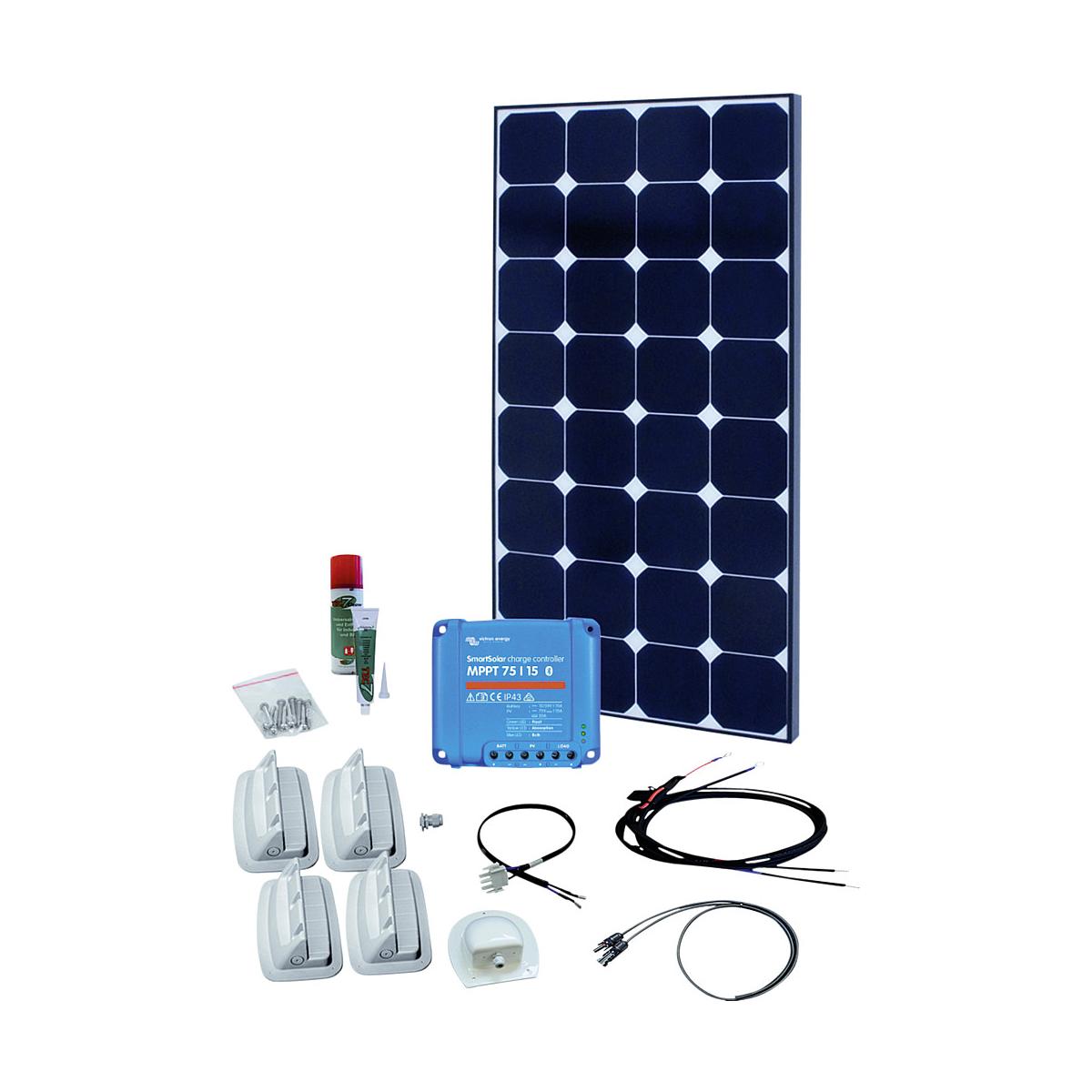 Regler mit Bluetoothfunktion Technische Daten: Leistung: 120 W Spannung: 12 VDC Maße 53,7 x 3,5 x 103,1 cm (B x H x T) Gewicht: 10,3 kg Lieferumfang: 1 Solarmodul, 120 W, 12 VDC 1 Regler Victron Smart Solar 75/15 1 Modulbefestigung Kit Easy Mount One 1 Dachdurchführung Water Tight One 1 Klebeset Easy Bond One 5 m Modulkabel QuickCab4 1,5 m Batteriekabel mit Sicherung (20 A) 1 Adapterkabel für EBL