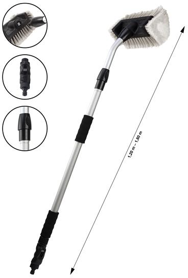 neueste Entwicklung auf dem Waschbürsten-Sektor Führungsstiel mit ca. 30° gebogenem Radius bietet jetzt noch leichteres und bequemeres Reinigen des Fahrzeugs neue Steckverbindung verhindert ein Lockern oder Verdrehen inkl.Alu-Teleskopstab (Länge 0,95-1,60m, ø28/25mm) und Wasser-Regulator Gewicht: ca. 1,12 kg
